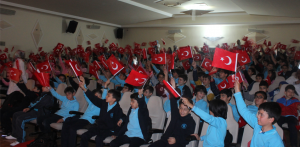 Programda okunan şiirler ve sinevizyon gösterilerinin yanı sıra öğrencilere dağıtılan bayraklarla program görsel bir şölene dönüştü.