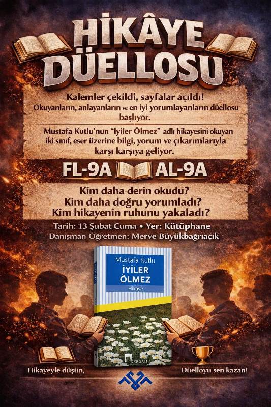 Etkinlik kapsamında 9. sınıf öğrencilerimiz, Türk edebiyatının önemli isimlerinden Mustafa Kutlu’nun kaleme aldığı “İyiler Ölmez” adlı hikâye üzerine derinlemesine okumalar yaptı. FL-9A ve AL-9A sınıfı öğrencileri; eserle ilgili bilgi düzeylerini, yorumlama güçlerini ve çıkarımlarını ortaya koyarak düşünsel bir düelloda buluştu.