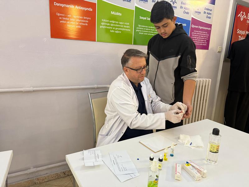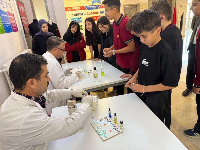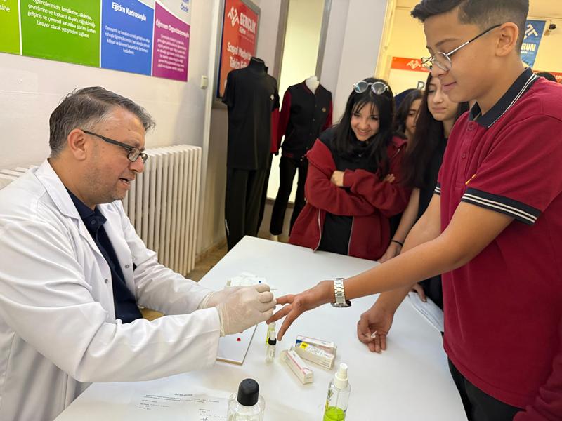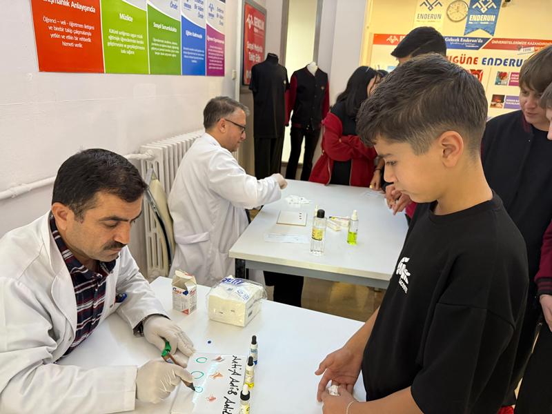 Okulumuzda Kızılay Haftası dolayısıyla anlamlı bir etkinlik gerçekleştirdik. Öğrencilerimizi kan gruplarını öğrenmeleri ve bu konuda farkındalık kazanmaları amacıyla düzenlenen çalışmada, Biyoloji Zümresi öğretmenlerimiz öğrencilerimizin kan gruplarını tespit etti. Öğrencilerimiz, düzenlenen etkinlikte kendi kan gruplarını öğrenme fırsatı buldu.